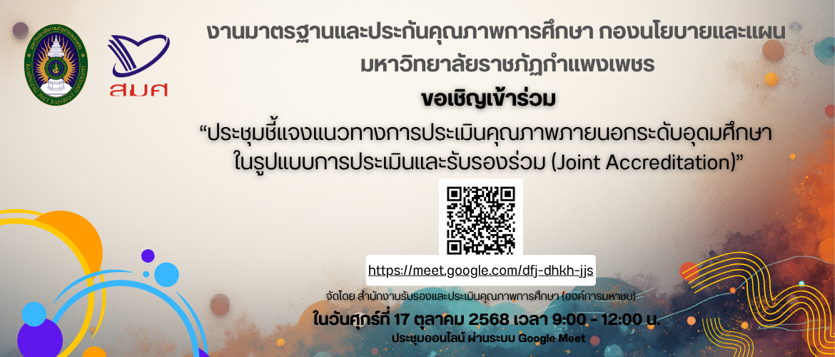 วันที่ 31 ตุลาคม 2562 สำนักประกันคุณภาพการศึกษา มหาวิทยาลัยราชภัฏกำแพงเพชร จัดกิจกรรมประชุมคณะกรรมการจัดทำมาตราฐานการศึกษาและแผนพัฒนาการจัดการศึกษาของมหาวิทยาลัยราชภัฏกำแพงเพชร ณ ห้องประชุมรวงผึ้ง(ห้องประชุมสภาคณาจารย์) อาคารเรียนรวมและอำนวยการ ตึก 14 โดยมีรองศาสตราจารย์ ดร.ปาจรีย์ ผลประเสริฐ รองอธิการบดีฝ่ายวิจัยและประกันคุณภาพการศึกษา เป็นประธานในพิธี อ่านต่อ.....